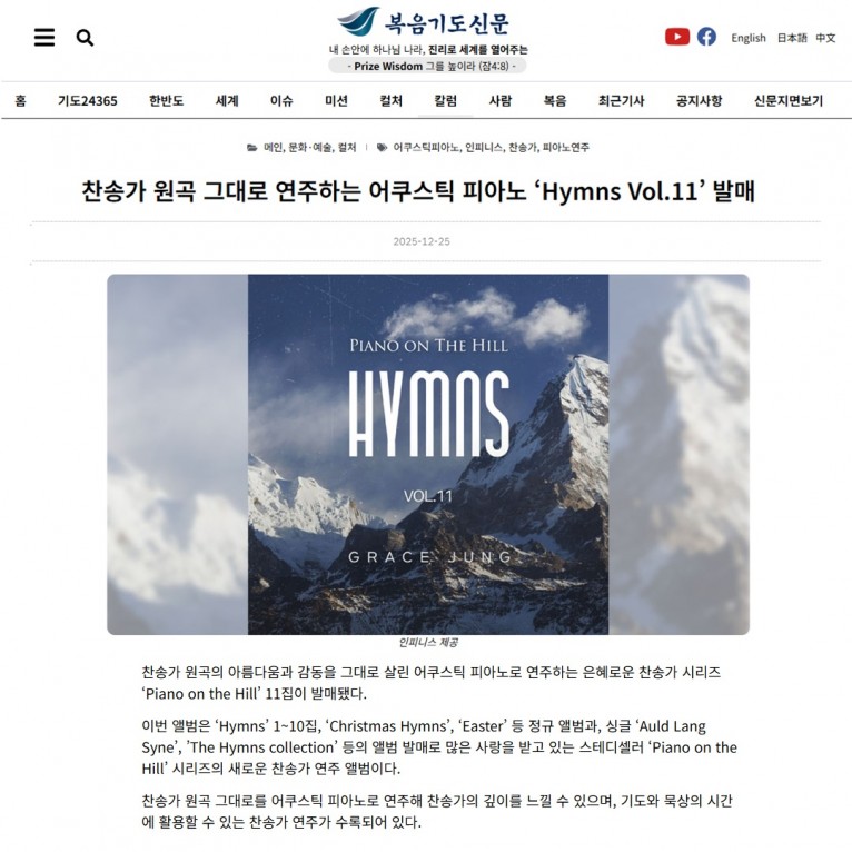 [기사] 찬송가 원곡 그대로 연주하는 어쿠스틱 피아노 ‘Hymns Vol.11’ 발매(복음기도신문)