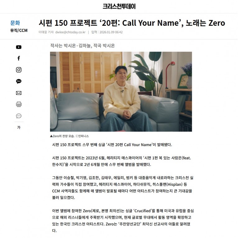[기사] 시편 150 프로젝트 ‘20편: Call Your Name’, 노래는 Zero(크리스천투데이)