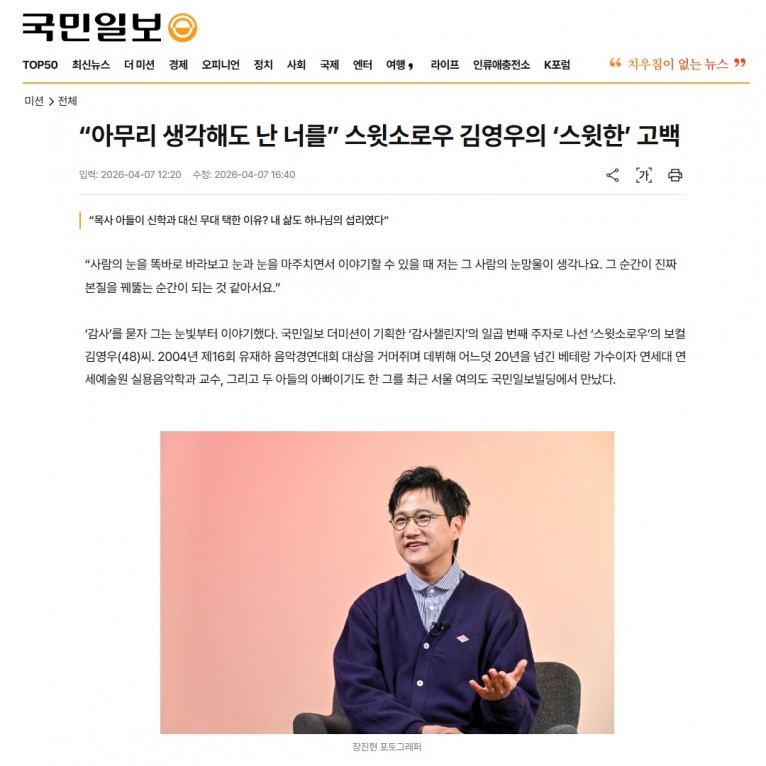 ‘감사’를 묻자 그는 눈빛부터 이야기했다. 국민일보 더미션이 기획한 ‘감사챌린지’의 일곱 번째 주자로 나선 ‘스윗소로우’의 보컬 김영우(48)씨. 2004년 제16회 유재하 음악경연대회 대상을 거머쥐며 데뷔해 어느덧 20년을 넘긴 베테랑 가수이자 연세대 연세예술원 실용음악학과 교수, 그리고 두 아들의 아빠이기도 한 그를 최근 서울 여의도 국민일보빌딩에서 만났다.