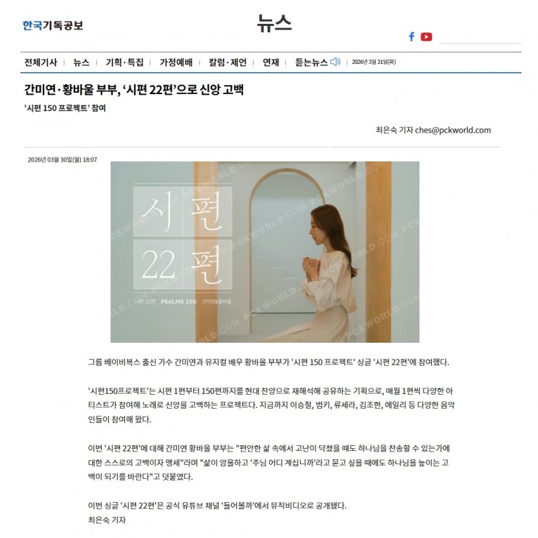 뮤직타임 [기사] 간미연·황바울 부부, ‘시편 22편’으로 신앙 고백(한국기독공보)