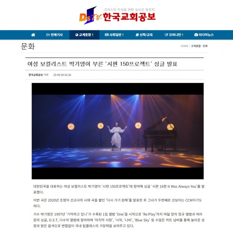 [기사] 여성 보컬리스트 박기영이 부른 ‘시편 150프로젝트’ 싱글 발표(한국교회공보)